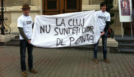 Un grup de tineri format din aproximativ 20 de ecologişti care se opun proiectului de la Roşia Montană şi reprezentanţi ai Iniţiativei Civice de Centru-Dreapta se află, la ora transmiterii acestei ştiri, în faţa sediului Universităţii "Babeş-Bolyai" (UBB) din Cluj-Napoca, unde îl aşteaptă pe premierul Victor Ponta, care asistă la decernarea titlului de Doctor Honoris Causa fostului comisar european Gunter Verheugen. Doi dintre ei au tricouri albe pe care scrie "Copy", respectiv "Paste", şi au un banner cu mesajul "La Cluj nu sunteţi doctor, domnule Ponta". De asemenea, în faţa UBB au sosit mai mulţi jandarmi. Anterior, mai mulţi tineri au afişat, la UBB Cluj, unde are loc decernarea titlului de Doctor Honoris Causa fostului comisar european pentru extindere Gunter Verheugen, bannere cu mesaje în limba engleză în care îl acuzau pe acesta de "lobby murdar", el întrerupându-şi discursul pentru a respinge acuzaţiile. Apoi, tinerii au fost scoşi din Aula Magna, unde se desfăşoară ceremonia, şi din universitate. La ceremonia de la Universitatea "Babeş-Bolyai" (UBB) asistă premierul Victor Ponta, ministrul de Externe, Titus Corlăţean, ministrul Educaţiei, Remus Pricopie, ministrul delegat pentru Cercetare, Mihnea Costoiu, fostul ministru de Interne Ioan Rus, Mitropolitul Clujului, IPS Andrei, primarul Emil Boc, episcopul greco-catolic Florentin Crihălmeanu, oficialităţi locale şi judeţene, parlamentari, studenţi şi cadre didactice.