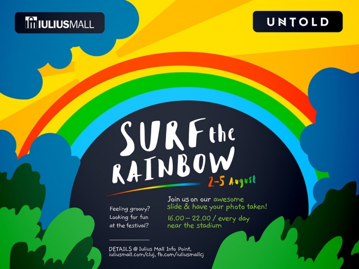 Lumini, spumă, muzică și multă distracție. Acestea sunt ingredientele petrecerii din perioada 2 – 5 august 2018, la care sunt invitați toți cei prezenți la Untold, festivalul momentului. Pentru că știm că îți place să fii surprins și ești o fire energică, am amenajat o zonă cool pentru mișcare, unde te poți încărca cu și mai multă bună dispoziție. „Surf the Rainbow” este un tobogan gigant, amplasat în proximitatea Cluj Arena, care te va purta „în al nouălea cer”. Așa că nu rămâne decât să accepți provocarea și să-ți inviți toți prietenii pe curcubeu.