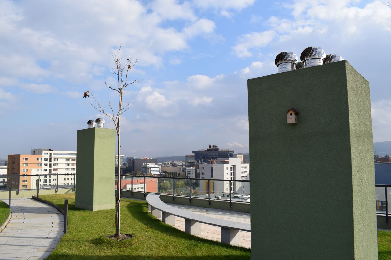 Prea puțină lume știe că, undeva în Cluj, pe terasa unui bloc de locuințe există un veritabil parc verde, cu alei și băncuțe, iarbă și copăcei, cu căsuțe pentru păsărele și cu o perspectivă superbă asupra orașului. O plasă special concepută de specialiștii în peisagistică ai Studium Green este aplicată pe peretele blocului, astfel încât să permită dezvoltarea mai multe tipuri de plante cățărătoare.