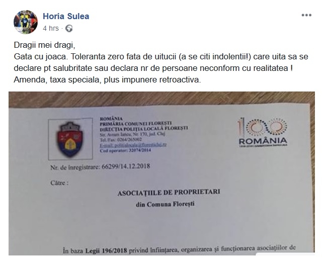 Înștiințări semnate de Horia Șulea au fost trimise președinților de asociații, cărora li se fixează termen data de 1 februarie 2019 pentru actualizarea cărților de imobil, în caz contrar urmând să fie amendați de polițiștii locali.