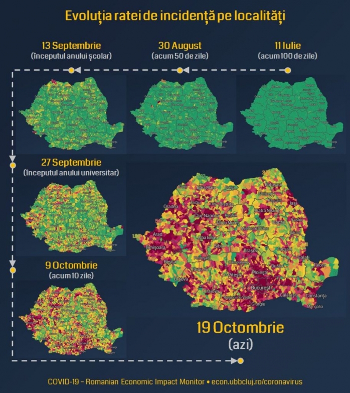 Cercetătorii Universității Babeș-Bolyai (FSEGA) au preconizat că România va atinge un record absolut în această săptămână, cum s-a și întâmplat marți. Ei au arătat într-un grafic cum s-a „înroșit” harta țării pe parcurs de 30 de zile.